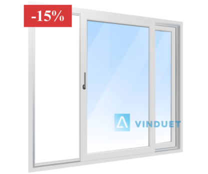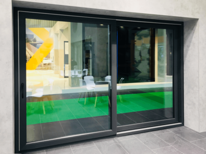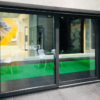 Døren består av to store deler, hvorav den ene er fast, mens den andre åpnes og kan bevege seg parallelt med den faste glassen.